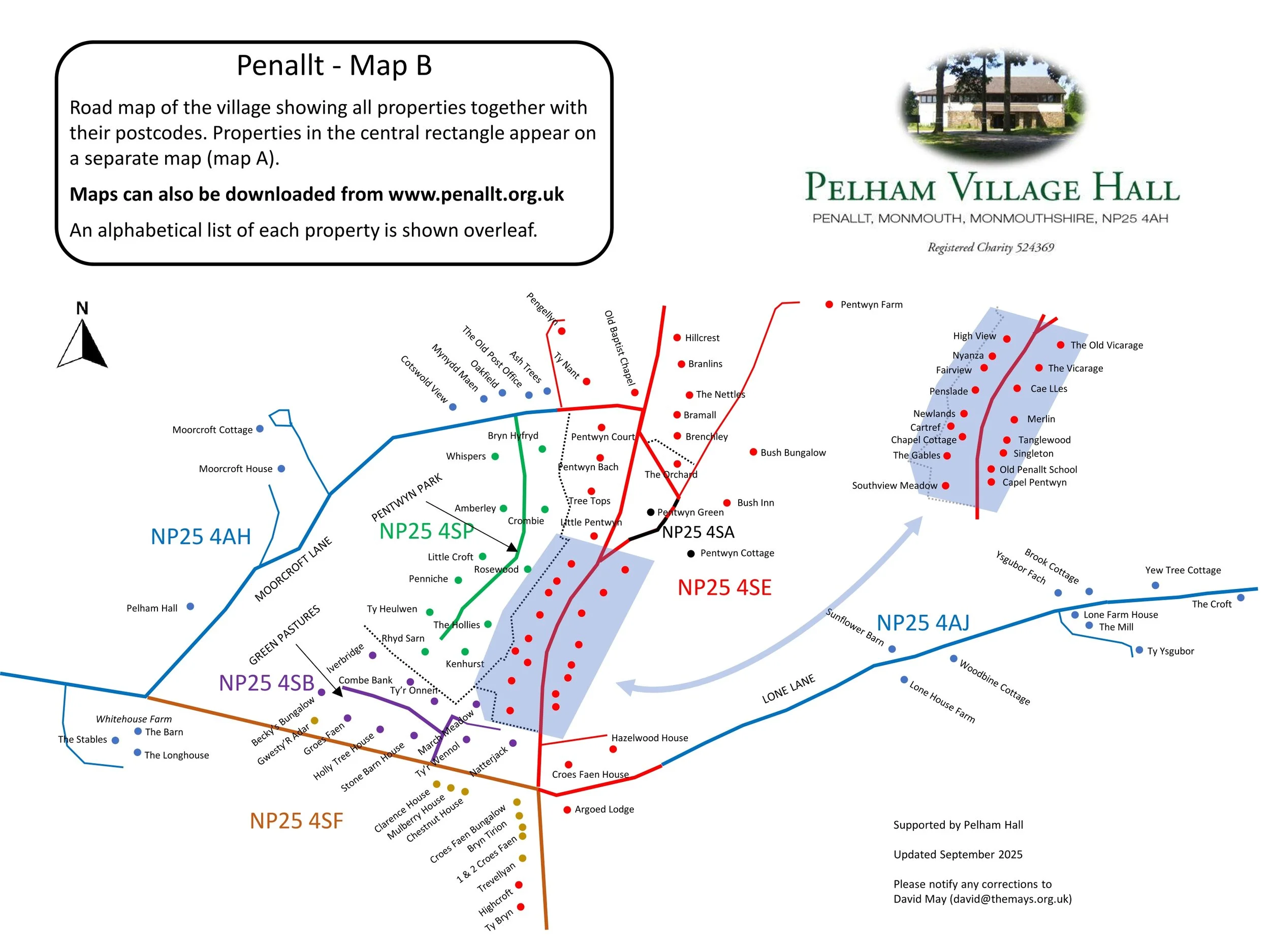 A few years ago, Prue Evill produced an invaluable map of the village showing the name and location of each house. Peter and Trish Hayward then updated this map to reflect new buildings and name changes and added post code areas. This was further developed in 2020 by David May with the incorporation of a more accurate road map and an alphabetical list of properties with their postcodes.